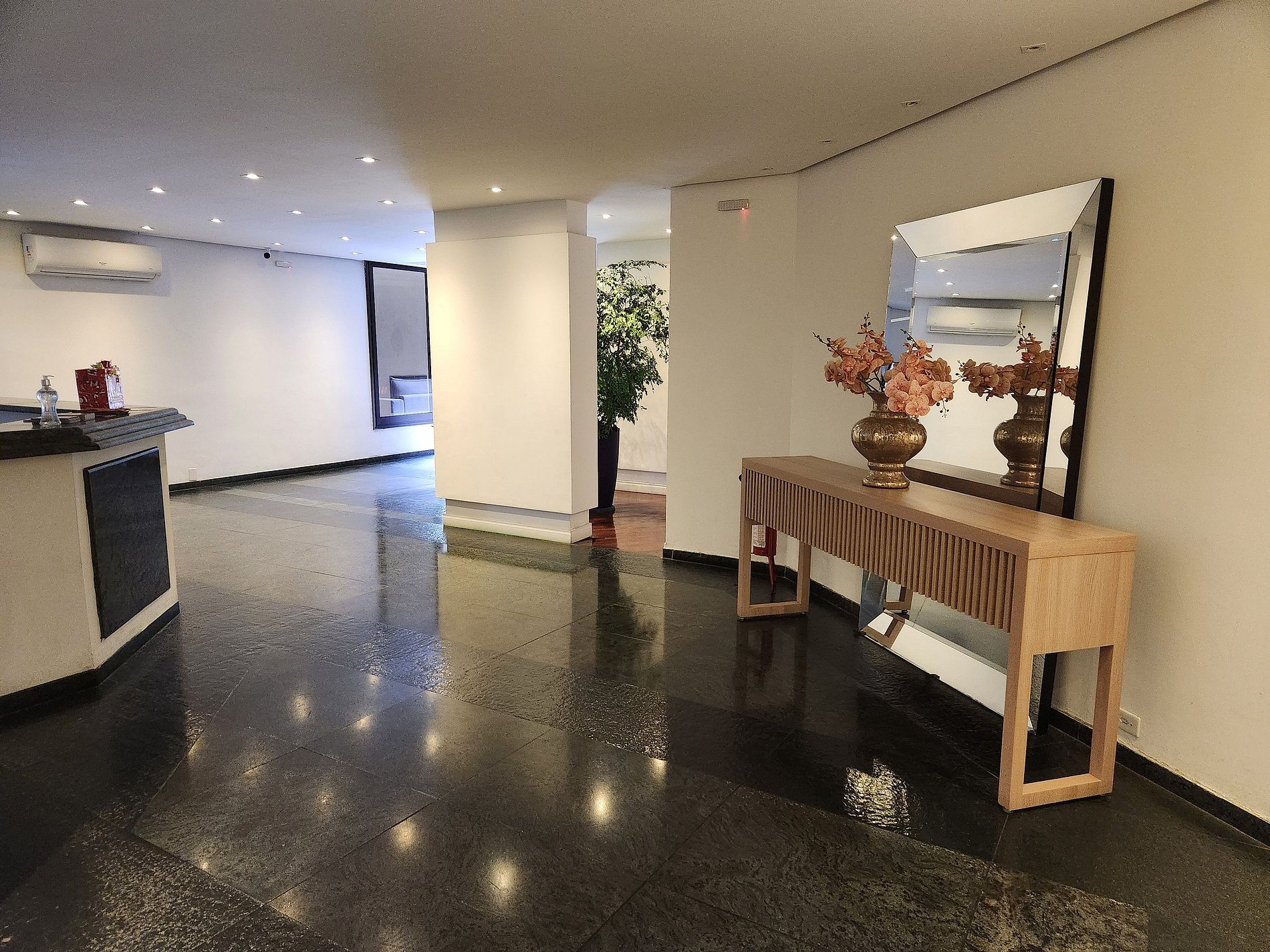O condomínio inclui piscina climatizada, saunas úmida e seca e academia.