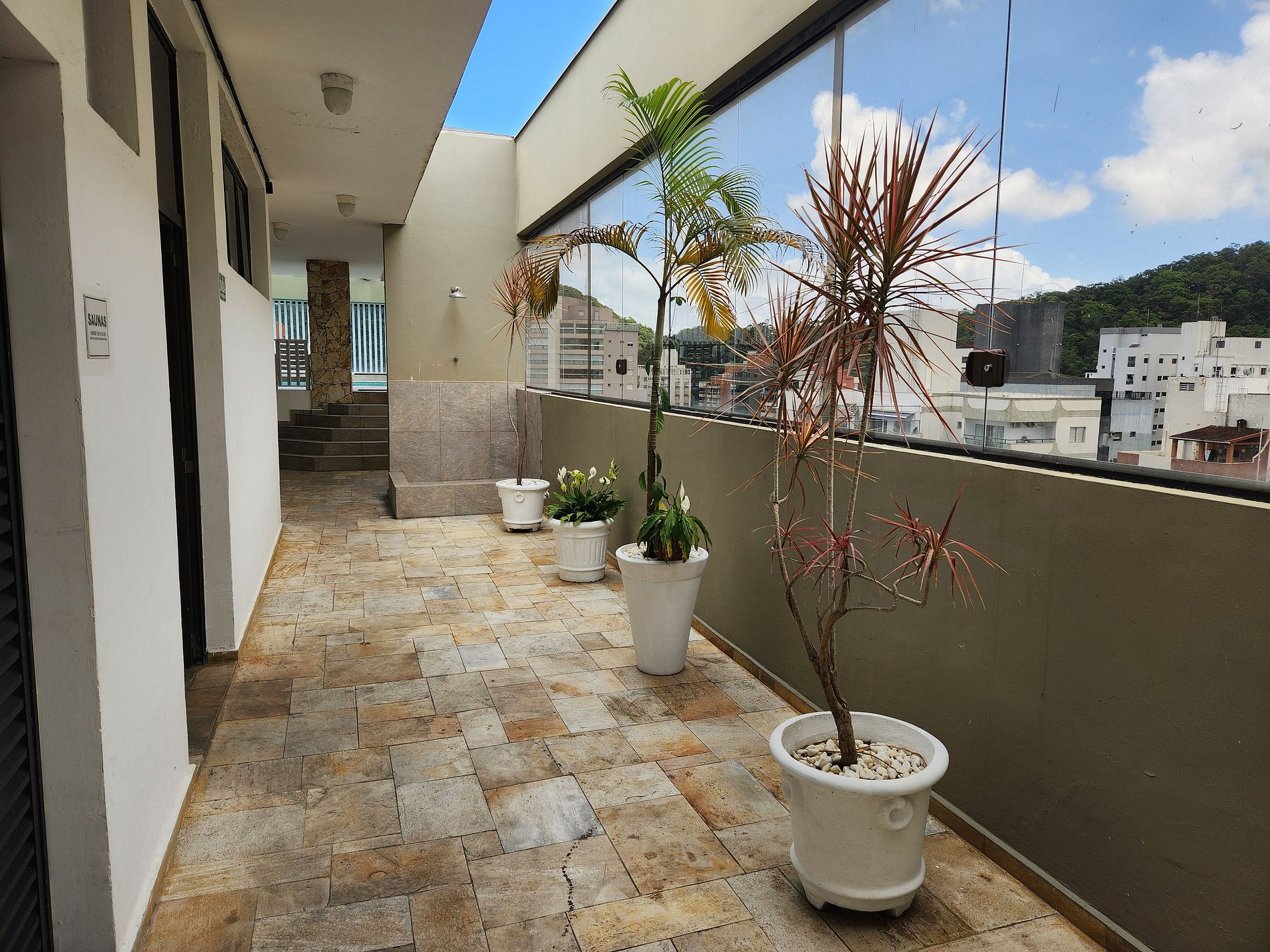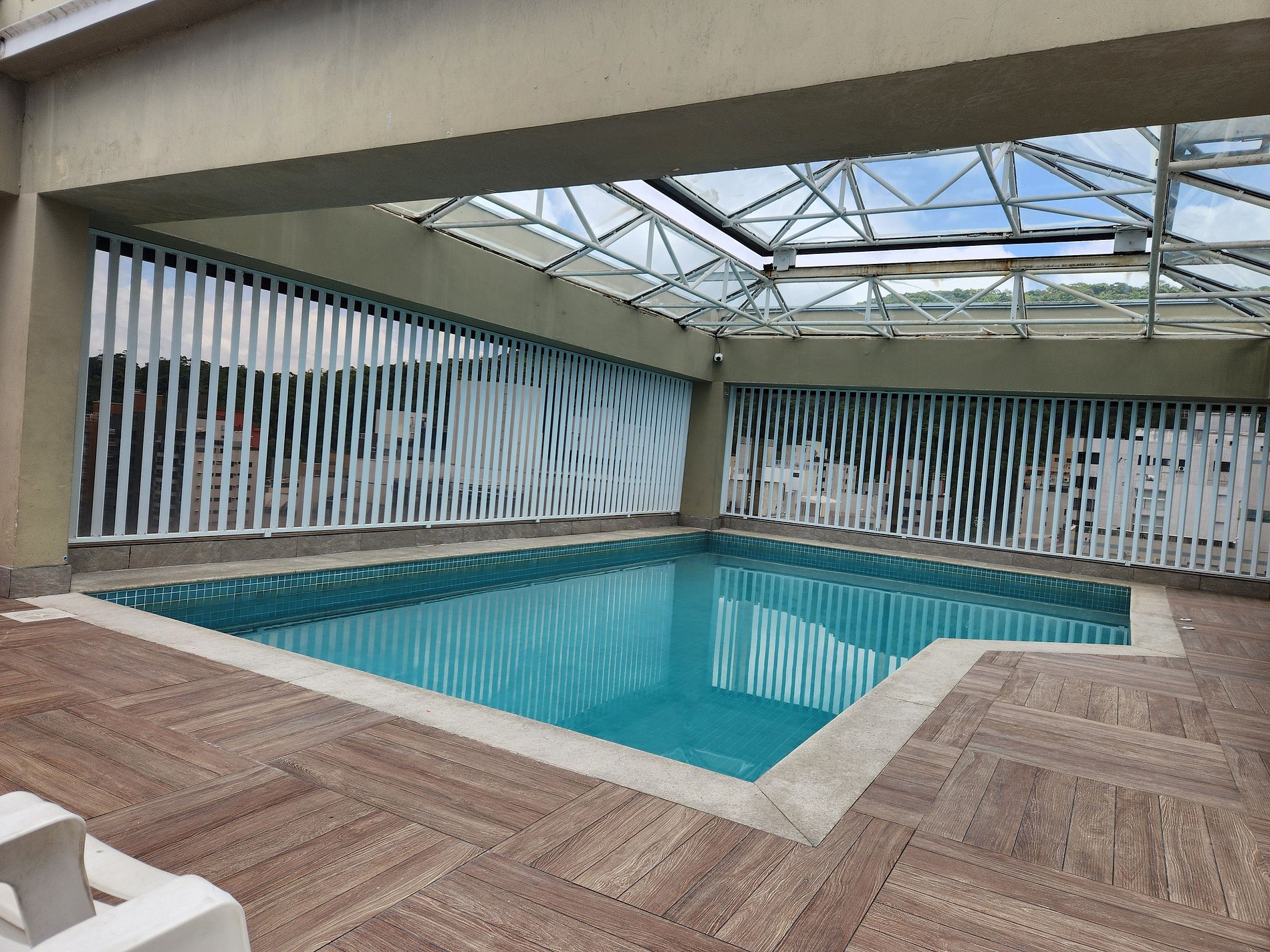 O condomínio inclui piscina climatizada, saunas úmida e seca e academia.